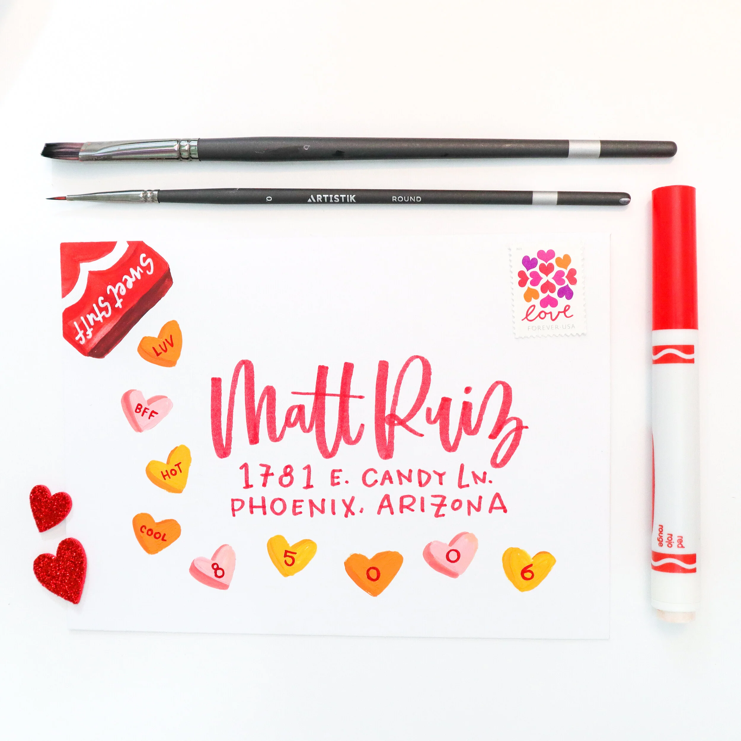 Use fine-tip red Sharpie to write phrases to the 4 candy hearts to the left of the address, and the zip code to the 5 hearts under the address.